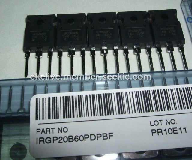IRGP20B60PDPBF absolute maximum ratings: (1)VCES, Collector-to-Emitter Voltage: 600 V; (2)IC @ TC = 25℃, Continuous Collector Current: 40A; (3)IC @ TC = 100℃, Continuous Collector Current: 22A; (4)ICM, Pulse Collector Current: 80A; (5)ILM, Clamped Inductive Load Current: 80 A; (6)IF @ TC = 25℃, Diode Continous Forward Current: 31A; (7)IF @ TC = 100℃, Diode Continous Forward Current: 12A; (8)IFRM, Maximum Repetitive Forward Current: 42A; (9)VGE, Gate-to-Emitter Voltage: ±20 V; (10)PD @ TC = 25℃, Maximum Power Dissipation: 220 W; (11)PD @ TC = 100℃, Maximum Power Dissipation: 86 W; (12)TJ, TSTG, Operating Junction and Storage Temperature Range: -55 to +150℃; (13)Soldering Temperature, for 10 sec. 300 (0.063 in. (1.6mm) from case) Mounting Torque, 6-32 or M3 Screw: 10 lbf·in (1.1 N·m).